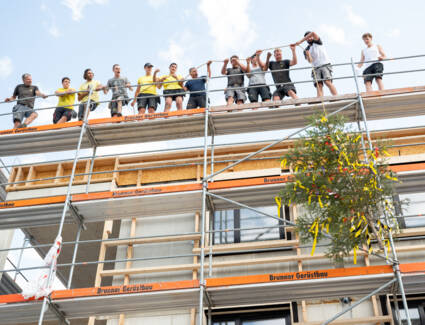 Auf dem künftigen Quartiersplatz fanden sich vergangene Woche an die 100 Planer, Handwerker und künftige Bewohner des Wohnparks „Am Römerstein“ in Höchst zur traditionellen Firstfeier ein. Plangemäß konnten die Zimmerer den Firstbaum am Dach befestigen, nachdem der jüngste von ihnen ein Hoch auf Bauherrschaft, Architekt und künftige Bewohner verlesen hatte.